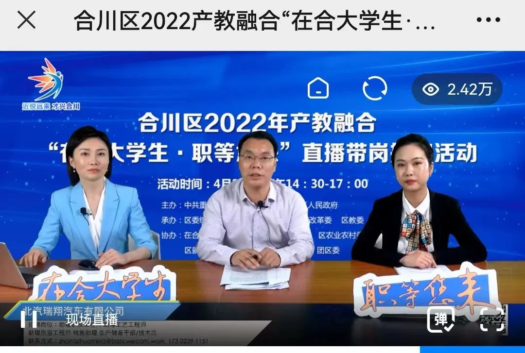 4月20日,2022年合川区产教融合“在合大学生•职等您来”直播带岗招聘活动成功举办。吸引2.51万余求职者在线观看。此次直播招聘活动旨在深化合川区产教融合,加强在合高校合作,促进高校毕业生就业,实现人才培养供给侧和产业需求侧结构要素全方位融合,打通人才对接供需渠道,助推全区经济高质量发展。
