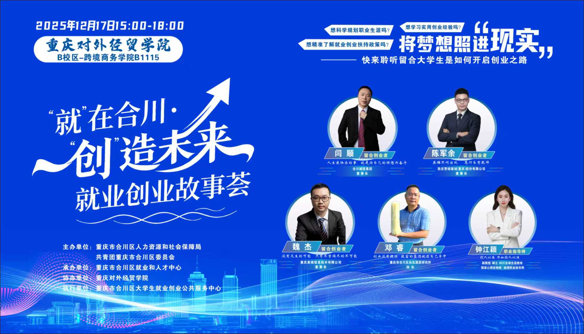 2025年12月17日,由重庆市合川区人力资源和社会保障局主办、合川区就业和人才中心承办、重庆对外经贸学院协办、重庆市合川区大学生就业创业公共服务中心执行的“就”在合川·“创”造未来就业创业故事荟重庆对外经贸学院专场即将开始!合川是一片创业的沃土,优秀的青年创业者不断涌现,创业之花在三江大地蓬勃盛开。本次活动邀请到4位创业者代表现场分享他们的逐梦历程,让我们一起聆听他们的故事。